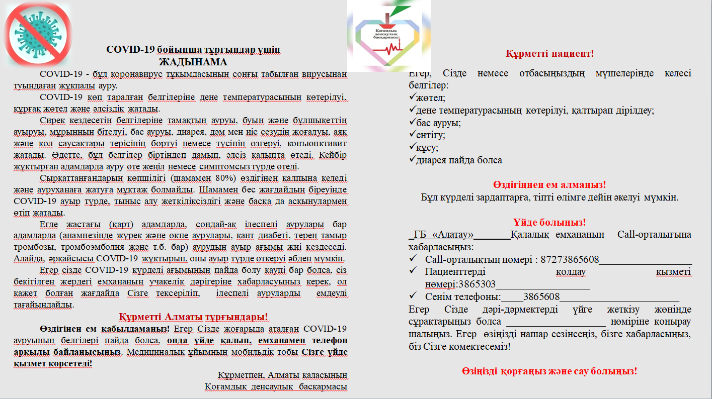 Өздігінен ем қабылдамаңыз! Егер Сізде жоғарыда аталған COVID-19 ауруының белгілері пайда болса, онда үйде қалып, емханамен телефон арқылы байланысыңыз. Медициналық ұйымның мобильдік тобы Сізге үйде қызмет көрсетеді!