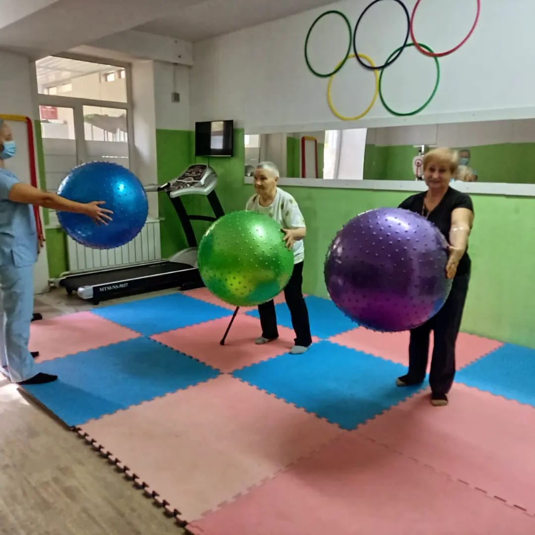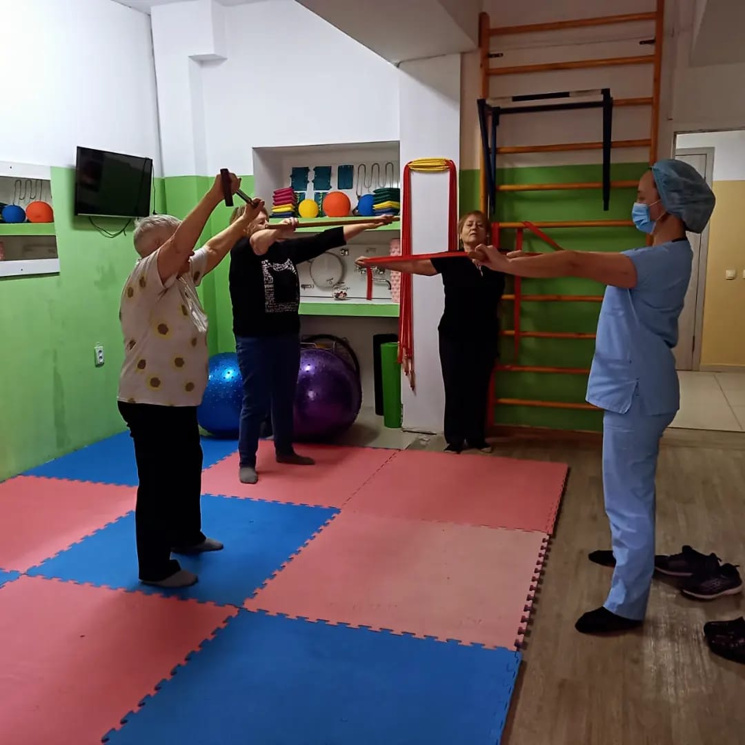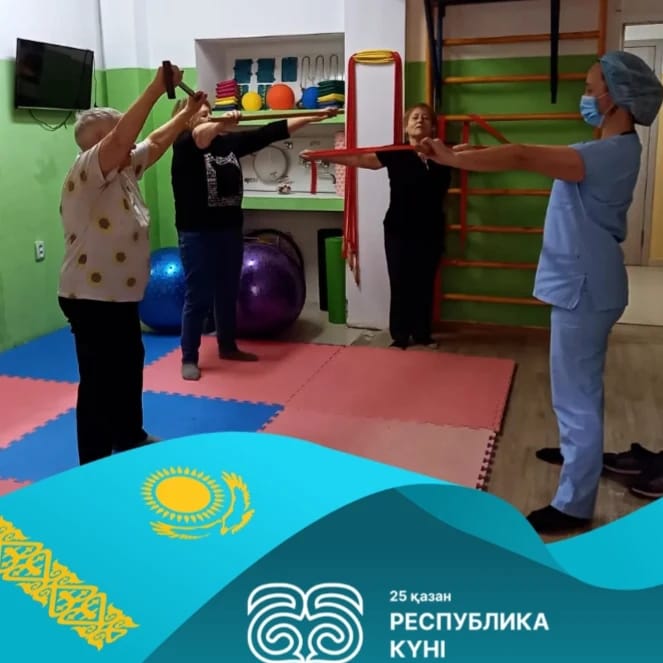 В зале ЛФК ГБ Алатау проводится оздоровительная гимнастика для людей пожилого возраста под девизом: «Секреты долголетия. Здоровье и физическая активность»